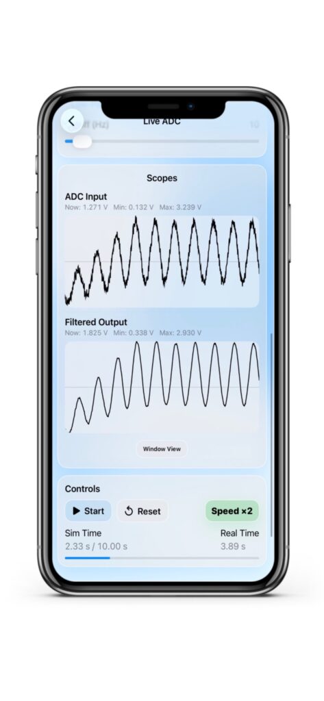 Filter parameters such as cutoff frequency can be adjusted in real time. Filter changes are applied instantly without restarting the simulation.